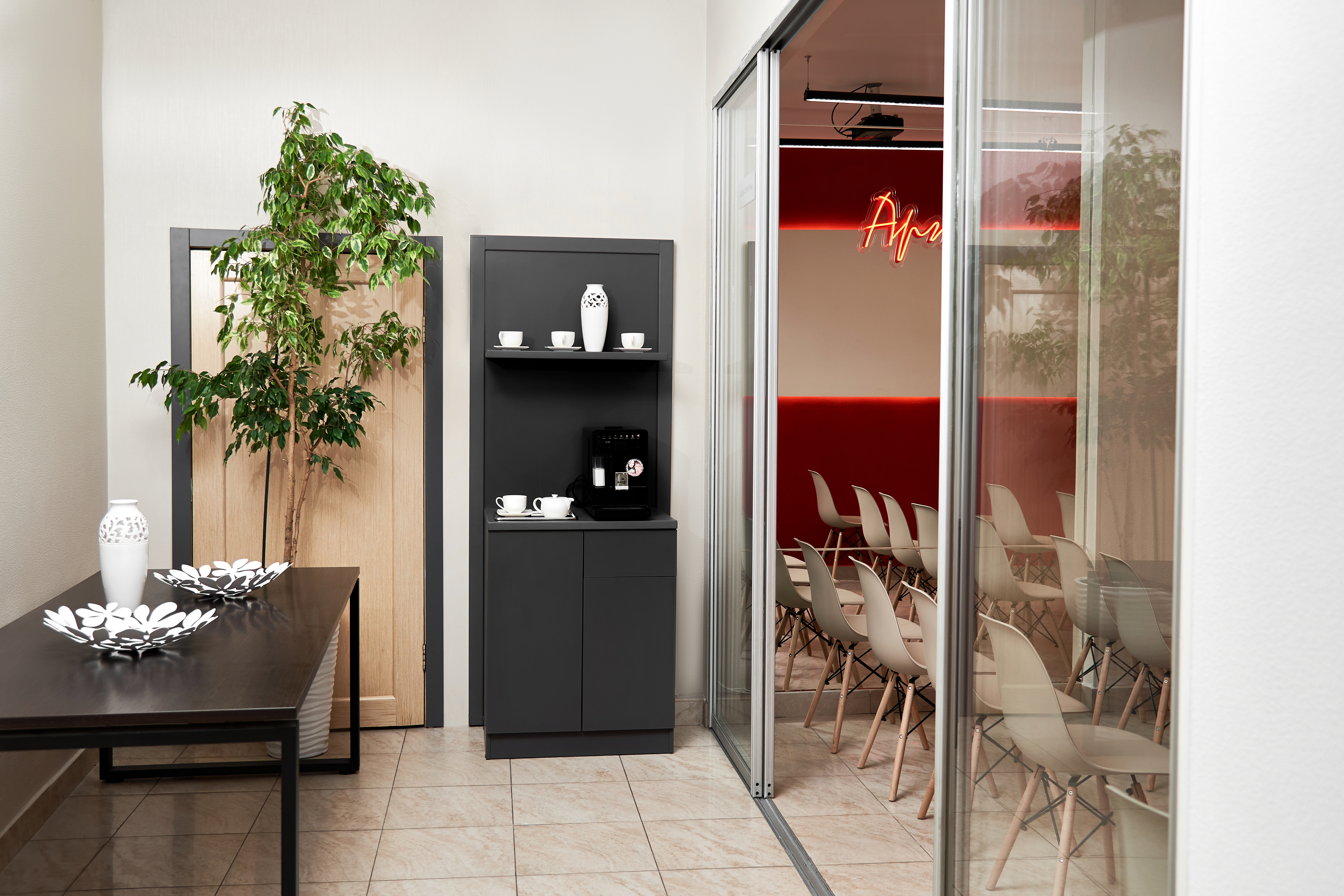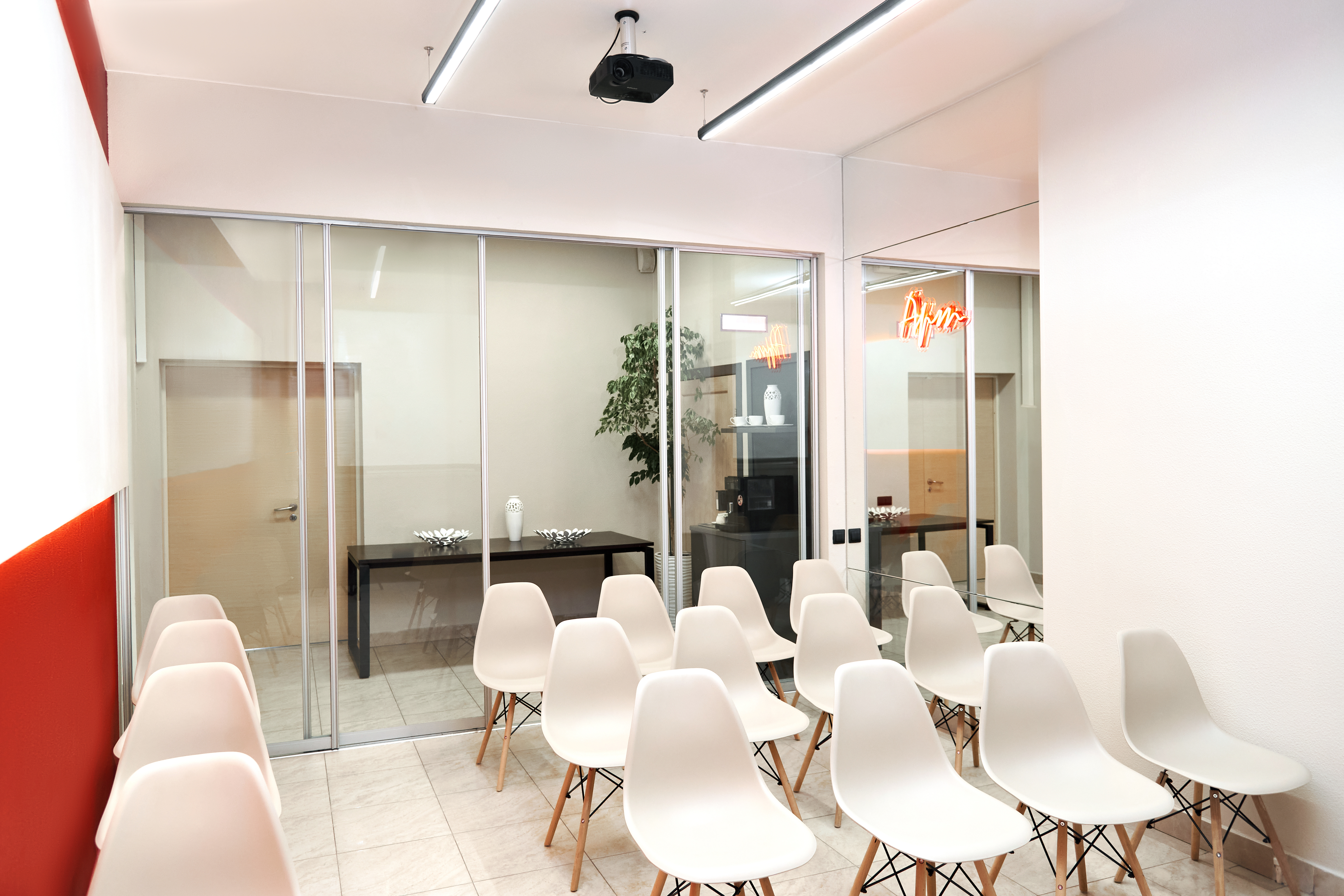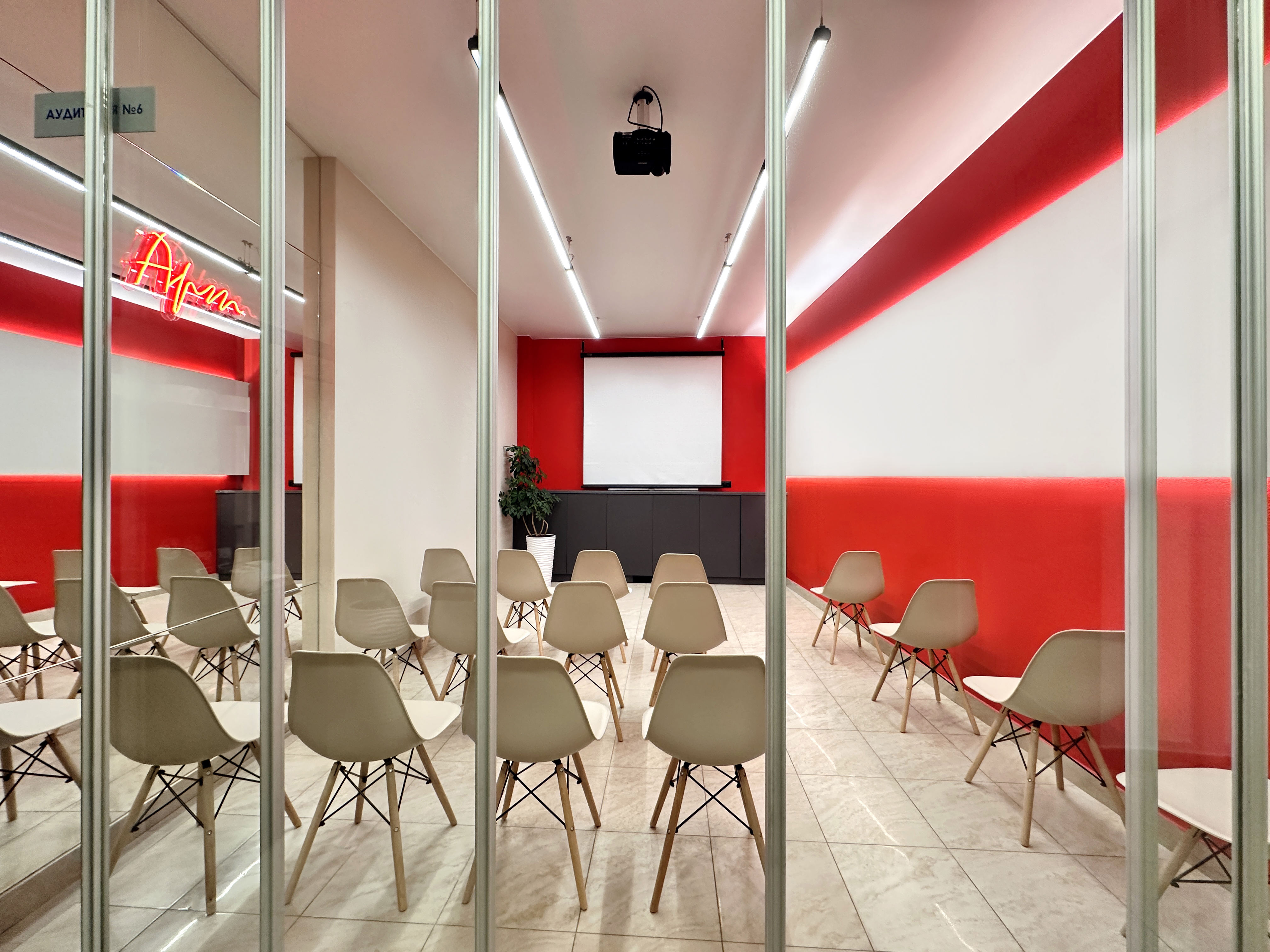 25 комфортных пластиковых кресел, проектор, экран, Wi‑Fi, стол, ноутбук, зерновая кофе‑машина, дополнительные стулья, Максимальная посадка на 25-30 человек.